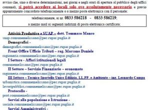 Al fine di salvaguardare la salute pubblica, si avvisa che, sino a diverse determinazioni, nei giorni e negli orari di apertura al pubblico degli uffici comunali, si potrà accedere ai locali solo ove assolutamente necessario e previo appuntamento concordato telefonicamente o a mezzo posta elettronica. A tal fine, nell'immagine sono reperibili tutti i contatti utili.