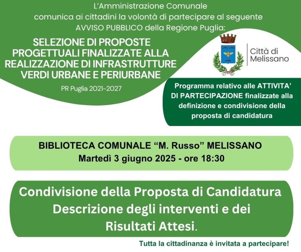SELEZIONE DI PROPOSTE PROGETTUALI FINALIZZATE ALLA REALIZZAZIONE DI INFRASTRUTTURE VERDI URBANE E PERIURBANE PR Puglia 2021-2027