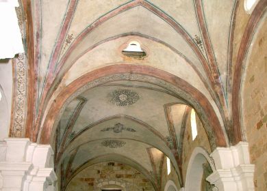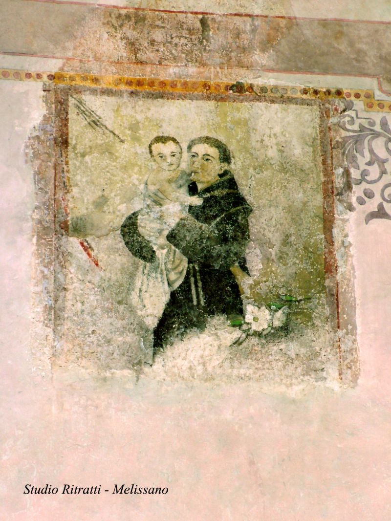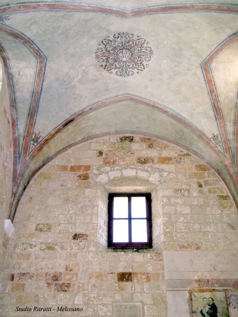 L'interno è composto da un'unica navata e scandita da quattro campate, delle quali la terza poco più alta. Ai lati, addossati al muro, sono presenti cinque altari, tra cui quello intitolato a S. Antonio che presenta una maggiore ricchezze nella decorazione. Le pitture che si sono salvate sono site sulla controfacciata (S. Antonio e resti di una Madonna), mentre alcuni reperti rinvenuti nel 1986 verranno presto riportati nell'ex sacro edificio.